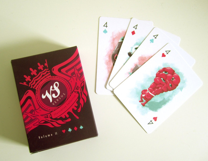 Versus is a deck of deluxe playing cards, pioneered by http://liquidlizard.co.uk/ . Each number in the deck is represented by a different illustrator. The 4's of the pack have been given a touch of Couk. You can buy the full pack or A6 print sets of all 13 sets of four here.